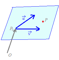 ≪解説≫平行でない2つのベクトル, を用いて,s+tの形に表されるベクトルはこれら2つのベクトルで張られる平面内にあります. したがって,2つの媒介変数s, tが各々実数値をとるとき =→OP0+s+t で表される位置ベクトルは,点P0を通り,2つのベクトル, を含む平面を表します. 例えば, (x,y,z)=(1,2,−3)+s(−1,2,1)+t(3,1,2) で表される図形は, 点(1,2,−3)を通り,2つのベクトル=(−1,2,1), =(3,1,2)を含む平面を表します. 【例1】のような2つの媒介変数を含む方程式から,これらの媒介変数を消去すればx, y, zの関係式が求められます. |
