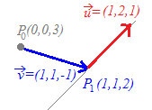 直線は点P1(4, 4, −2)を通り,方向ベクトル=(−1,3,−2)に平行だから,平面上のベクトルはP0(3, 2, 1)とP1を結ぶベクトル→P0P1とを用いて