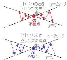 なんで 答を出すだけならどちらでもできますが, たとえば,|r|>1のとき,あるnの値でan=αになると,an+1−α=r(an−α)=0となって,それ以後のan+1 , an+2 , an+3 , ...はすべてαになって抜け出せなくなります(蟻地獄).この値は凹レンズの焦点のように,そこから光が出てくる場所になっています. |r|<1のときは,n→∞のときにだんだん近づいていく目標地点という意味があります.凸レンズの焦点のようなものです.この場合もあるnの値でan=αになると,an+1−α=r(an−α)=0となって,それ以後のan+1 , an+2 , an+3 , ...はすべてαになって抜け出せなくなります. |