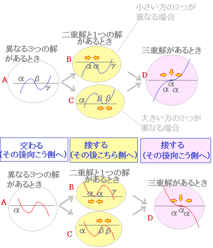 【解,二重解,三重解でx軸に触った後の向き】…世間的・通俗的な解説〜♪