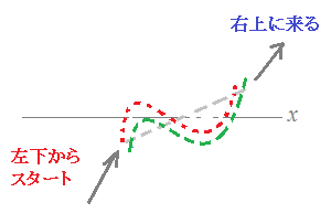実係数の3次方程式ax3+bx2+cx+d=0(a>0,b,c,dは実数)の実数解が「ない」ということは起りえなくて,「少なくとも1つはある」ということは,右のような図によっても分かる.左下からスタートして,右上に行くのであるから,少なくとも1回はx軸に触れる.もちろん,赤で示したように3回触れる場合(異なる3個の実数解がある場合)や,緑で示したように2回触れる場合(実数の重解1つと他の1つの実数解)もある. |