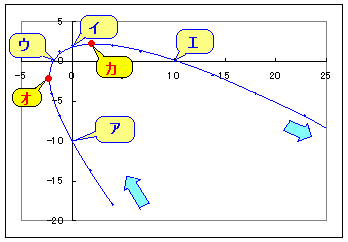 ア:(0,-10) t=-2(2)においてy=0よりt=0,3 これよりx=-2,10 ウ:(-2,0) t=0→* |