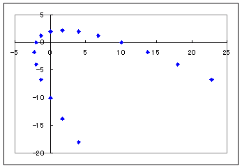 y=-t2+3t ・・・(2) ■また,この表から表計算ソフト(Microsoft ExcelTR)を用いてグラフにしたものが右の図1です。(グラフの種類で棒グラフ,円グラフなどと並んで散布図というものがあり,これを選ぶと表中のx,y座標をもつ点をプロットできます。) ■この点を結んでなめらかな曲線にしたものが右の図2です。