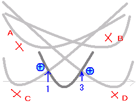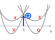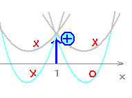 x軸とただ1回交わる。2回以上交わる図は書けない。 f(1)<0かつf(3)>0のときも同様 ※ f(a)・f(b) < 0 という形に公式化するやり方もありますが,覚えるまでもないでしょう。 |