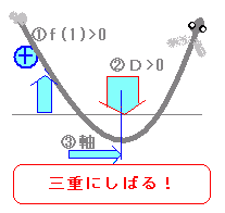 f(k) > 0 ・・・(1) は同様 D > 0 ・・・(2) は同様 軸 < k ・・・(3) とする。 |