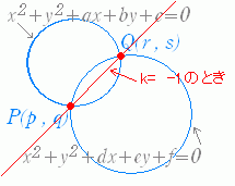 ○ 2つの円 x2+y2+ax+by+c=0 …(1) x2+y2+dx+ey+f=0 …(2) が2点で交わるとき,方程式 x2+y2+ax+by+c+k(x2+y2+dx+ey+f)=0 は,定数 k の値にかかわらず2交点を通る円を表す. ○ ただし,k=−1 のときは,2交点を通る直線を表す. ○ k=0 のときは,円(1)を表す.円(2)はこの形式では表せない. ○ 方程式 h(x2+y2+ax+by+c)+x2+y2+dx+ey+f=0 も同様 ○ h=0 のときは,円(2)を表す.円(1)はこの形式では表せない. |