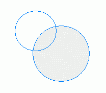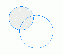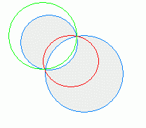 [補足説明] (*1) ○ 元の2円(1)(2)が共有点を持たない場合や1点で接する場合でも方程式(A)は円になるが,「2交点と・・・を通る円の方程式を求めよ」という問題は作れないから,「2交点で交わる場合しかこの問題は出ない」と考えてよい. ○ 実際に (x−p)2+(y−q)2=R ( R>0 )の形になることを示さなくても,x2+y2+…=0 のグラフが異なる2点 (p ,q) , (r , s) を通っているのなら,虚円でも点でもなく円であると断定してよい. ○ k=−1 のときは,方程式は 0x2+0y2+a’x+b’y+c’=0 すなわち a’x+b’y+c’=0 の形になり,これが異なる2点 (p ,q) , (r , s) を通っているのなら,それは2交点を通る直線を表す.(無限の彼方に中心があって半径が無限大の円を考えるとよい.) (以下の説明はややハイレベルなので,読まなくてもよい) ○ 左図の動画において x2+y2+ax+by+c+k(x2+y2+dx+ey+f)=0 が通過する場所についての目安 1) たとえば x2+y2<9 すなわち x2+y2−9<0 は次の図の灰色の部分を表し,x2+y2>9 すなわち x2+y2−9>0 は白色の部分を表す. 2) 同様にして (x−3)2+(y + 3)2<16 すなわち (x−3)2+(y + 3)2−16<0 は次の図の灰色の部分を表し,(x−3)2+(y + 3)2>16 すなわち (x−3)2+(y + 3)2−16>0 は白色の部分を表す. 3) そこでk=− の値が「正」になる点は,−正÷負または−負÷正の場合だから,点 (x , y) は右図の灰色の部分にある.同様にして,k の値が「負」になる点は−正÷正または−負÷負の場合だから,点 (x , y) は右図の白色の部分にある. そこで,k>0 のとき,2交点と灰色の部分を通る円は右図の赤で示したような円になり,k<0 のとき,緑で示したような円になる. |