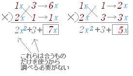 ···x2+(1·1+3·2)x+···=···x2+7x+··· になり,合わない (イ)は, ···x2+(1·3+1·2)x+···=···x2+5x+··· になり,合う