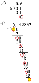 と定義します. これを小数に直すときに,「商」ではなく「余り」の方に着目することが重要です. 正の整数nで割ったときの余りrは0≦r≦n−1のn種類ありますが, ア) のように計算の途中で,余り0が登場したら,割り切れて有限小数になります. イ) のように,どこまで行っても割り切れない場合,右図の 結局, 整数