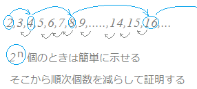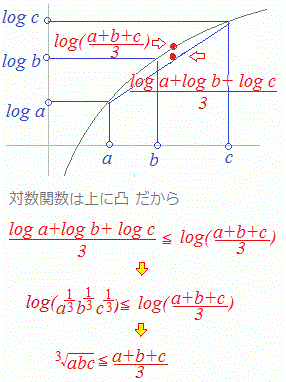 ![]() ≧≧ だから ≧…(1) 次に(1)において d= とおくと (左辺)=== (右辺)= となるから,両辺を4乗すると ()4≧abc 両辺を>0で割ると ()3≧abc ゆえに ≧ (C) さらにもっと一般的にn個の文字に対して証明するには,対数関数y=log xが上に凸であることを利用するのが簡単ですが,通常不等式の証明の単元を習うときにはまだ対数関数を習っていないため,対数関数が上に凸であることを利用する方法は高3以上の受験向きとなります. ![]()