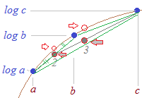 〇2点の場合⇒この点は右図で赤丸灰生地で示した2という点になる これに対して は 〇3点の場合 と書けることに注意すると,x座標でa, b, cの平均は,x座標a, bの平均とx座標cを1:2に内分する点になる. 同様にして そこで青で示した3つの点の重心(x座標の平均とy座標の平均を座標とする点)は右図の緑で示した三角形の内部にある.(赤丸灰生地で示した3という点) これに対して は 〇4点の場合 以下同様にして と変形すると,3点の重心と4番目の点を1:3に内分する点になるから,4点でできる4角形の内部にある. これに対して,右辺はその点から上に伸ばしてグラフと交わる点のy座標になるから |