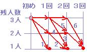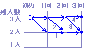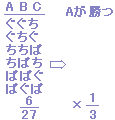 勝つ人1人の選び方=2通り その各々について,勝つ手の選び方=3通り 以上により,プレーヤーが2人から1人になる確率は ![]()