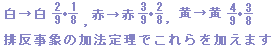 袋の中に白玉2個,赤玉3個,黄玉4個の計9個の球が入っている.A,Bがこの順に球を1個ずつ取り出し,取り出した玉は元に戻さないものとする.このとき,AとBが同じ色の玉を取り出す確率を求めよ.