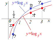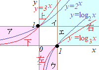 ≪要点≫ (C) 2つの対数関数のグラフを重ねて書くときは,底の大小関係と区間0<0, 1<∞に応じて,上下左右をはっきりさせます 【例5】 ![]() ウの0<x<1, y<0において,log3xは左にある イのx>0, y>1において3xが上だから エのx>1, y>0において,log3xは右にある |