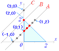 ○ y−x のままでは,単なる「式」で x も y も変るので分かりにくい.![]() これを,y−x=k すなわち y=x+k とおくと「方程式」になり「直線」を表わす. このように,求めたい式の値を … =k とおき,k の取り得る値の範囲を考えると「図形」に対応させて考えることができる. ■ 1つの直線上では k の値は同じ ○ 例えば,図1のAの直線の方程式は y=x+1 で,k=1 になっている. この直線の方程式が y=x+1 だということは,この直線上のどの点でも y=x+1 すなわち y−x=1 が成り立つことを表わしている. x=−1, y=0 の点では,0−(−1)=1○ 図1のBの直線の方程式は y=x+2 で,この直線上のどの点でも y−x の値は 2 になる. x=0, y=2 の点では,2−0=2○ 連立不等式 x≧0 , y≧0 , y≦−x+2 で表わされる領域は,上の水色の三角形の内部及び周上であるが,この領域内における y−x の最大値と最小値を求めるには次のように考えるとよい. y−x=k すなわち y=x+k とおくと,k は直線の切片を表わすから,上に行くほど大きく,下に行くほど小さくなる. 例えば,直線Cは y=x+3 で k の値は大きいが,この直線は与えられた三角形の領域を通っていない. |