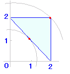 x2+y2=k とおくと k は原点を中心とする円の半径(の2乗)を表わす.点 (2 , 2) において最大値 k=22+22=8 となる. 最小値は x2+(−x+2)2=k の判別式=0 から求められるが,この図では点 (1 , 1) において最小となるのは明らか点 (1 , 1) において最小値 k=12+12=2 となる. |