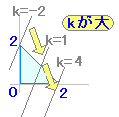 x , y が,不等式 x≧0 , y≧0 , y≦−x+2 を満たすとき,2x−y の最大値と最小値を求めよ. [解答] 2x−y=k とおく y=2x+(−k) において切片は −k だから,k が大きくなると切片は小さくなる. (0 , 2) のとき最小値となり,k=0−2=−2 (2 , 0) のとき最大値となり,k=4−0=4 …(答) ※ k の値は,図から切片として求まる場合もあるが,この問題のように (x , y) の座標が先に求まる場合は,代入すれば直ちに求まる(いただき〜♪と考えるべし). |