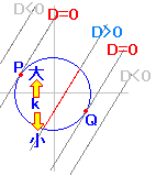 [解答]y−2x=k すなわち y=2x+k とおくと,傾き 2,切片 k の直線になる. x2+y2≦5 において k の値が変化するとき,図のように円に接するとき k が最大・最小となる. y=2x+k と x2+y2=5 が接するときの k の値を求める. y を消去すると x2+(2x+k)2=5 5x2+4kx+(k2−5)=0 接するのは判別式が0となる時だから D’=(2k)2−5(k2−5)=−k2+25=0 より k=±5 2つある接点 P, Q のどちらが k=5 に対応するのかは,見れば分かる.上にある方( k の大きい方)が k=5 となる.よって,最大値は 5,最小値は - 5 …(答) この問題では,最大値・最小値が先に求まり,それを実現する x , y の値がまだ求まっていない. |