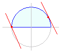 2x+y=k すなわち y=−2x+k とおく.図の上半円において y=−2x+k との接点は,判別式で求められる. x2+(−2x+k)2=5 5x2−4kx+(k2 -5)=0 D’=(2k)2−5(k2 -5)=−k2+25=0 より k=5 (>0) 左下の方の接点から得られる値 k=−5 は使わないことに注意.上半円の領域には左下の接点はない.(−, 0) において最小値 −2 をとる. よって,最大値 5,最小値 −2 |