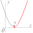 (1)より=x−2 …(3) ただし,t≧0 により x≧2 …(4) (3)を(2)に代入して t を消去すると y=(x−2)2 ただし x≧2 の部分 …(答) |