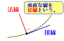 ※ 数学では,接線と法線が分かればOKです。 ![]() (1)← また,Aを通り 2つのベクトルが垂直(直角)となる条件は (内積)=0 の関係で表せるので,以上の関係は すなわち で表せます. |