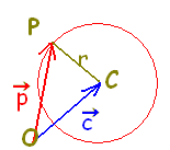 ○平面上において点Cを中心とする半径rの円の方程式は,又は 定点C,定数rに対して,CP=rを満たす点はCからの距離がrですから,半径rの円周上にあります。Cを中心とする半径rの円周上にあれば,CP=rです。 これをベクトルの大きさ| |で表すと, 2乗すれば,同じものの内積になりますので(2’)と書くこともできます。 |