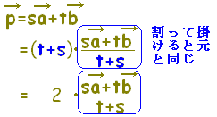 (参考2)○たとえば,s+t=2のとき ![]() のように変形すると,□(右図のP’)はABの内分点(s,t>0のとき),又は外分点(s,tの一方が負の数のとき)だから,OPはOP’を2倍にしたもの。 ![]() ○s+t の値に応じて,点Pは次の図のような直線上に存在する。 ![]() |