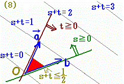 =>[作者]:連絡ありがとう.見た目の通りで,s+t=1は直線AB,s≧0はOBの上(以上)だから,直線ABのBよりもA側の半直線 ベクトル方程式の点の存在範囲について、s+tの範囲が指定されているものだけでなく ☆≦s≦★、○≦t≦◇などsとtの範囲が無関係に変化するものも紹介して欲しいです