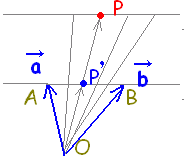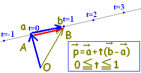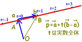 ![]() 位置ベクトルの表す点Pは, には,直線AB全体が対応します。・・・(1) ![]() には,半直線ABが対応します。・・・(2) ![]() には,線分ABが対応します。・・・(3) ![]() |