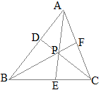 【問題1】右図の△ABCにおいて,ABを1:2に内分する点をD,ACを2:3に内分する点をFとし,BFとCDの交点をPとする.さらに,APの延長がBCと交わる点をEとする. このとき,BE:EC, AP:PE, BP:PF, CP:PDをそれぞれ最も簡単な整数比で表してください.