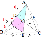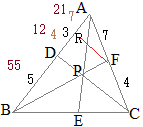 • この図の場合,交点の内の1つは三角形の外に来る. • 「分子」→『分母』の見方として,「頂点.交点」→『交点.頂点』の順に正確に見ていく必要がある. • 直線上の交点間の比は求められない.求めたいものは三角形の辺の内分比または外分比として設定することが重要 よって,BP:PF=55:12…(答) |