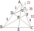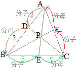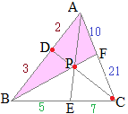 【問題3】右図の△ABCにおいて,ABを2:3に内分する点をD,BCを5:7に内分する点をEとし,CDとAEの交点をPとする.さらに,BPの延長がCAと交わる点をFとする. このとき,CF:FA, AP:PE, BP:PF, CP:PDをそれぞれ最も簡単な整数比で表してください. |