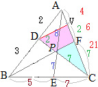 ここでCF,FVの縮尺を変えて,CF:FV=7:2=21:6にしておくと,CF:FV:VA=21:6:4FV:VA=BD:DA=3:2だからCF:FAも求まるのだ! よって,CF:FA=21:10…(答)