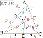 と変形すると,問題よりp:q=5:3 また と変形すると,問題よりp:r=4:7 pを20にそろえると,p:q:r=20:12:35 BE:EC, AX:XE, BX:XF, CX:XDをそれぞれ最も簡単な整数比で表してください. (*)より と変形できるから,Xは,「BCを35:12に内分する点E」と「A」を20:47に内分する点になる. BE:EC=35:12…(答) AX:XE=47:20…(答) (*)より と変形できるから,Xは,「ACを35:20に内分する点F」と「B」を12:55に内分する点になる. BX:XF=55:12…(答) (*)より と変形できるから,Xは,「ABを12:20に内分する点D」と「C」を35:32に内分する点になる. CX:XD=32:35…(答) |