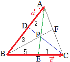だからはBCをm:nに内分する点Eです.このように分子の係数の和と分母が一致していれば,それは内分点であることを表しています. しかし,それらが一致していなければ のように変形すると(7で割って7を掛ける) 「内分比も縮尺比も分かる」「一石二鳥」なのです. 内分点までのベクトルを縮小したものが まず,分子の係数の和を分母にして,内分公式に合う式にして,その後で分数を調整するのがコツ BE:EC=4:3 AP:PE=7:6 BP:PF=10:3 CP:PD=9:4 |