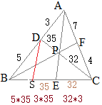 (3) BE:ECを求めよBE.ECに平行な2直線が交わるように1本増やす. DからPEに平行な線を引いて,BEとの交点をSとおくと,CE:ES=CP:PDとなる CE:ES=CP:PD=32:35=3*32:3*35 SEの尺度を35→3*35に3倍しているから,ECも32→3*32とすると BE:EC=8*35:3*32 よって,BE:EC=35:12…(答)