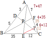 (4) AP:PEを求めよAP.PEに平行な2直線が交わるように1本増やす. EからPFに平行な線を引いて,CFとの交点をTとおくと,AP:PE=AF:FTとなる CT:TF=CE:EB=12:35=4*12:4*35 CFの尺度を4→4*47に47倍しているから,FAも7→7*47とすると AF:FT=7*47:4*35 よって,AP:PE=AF:FT=47:20…(答) |