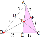 【問題4】右図の△ABCにおいて,ABを3:5に内分する点をD,CAを4:7に内分する点をFとし,BFとCDの交点をPとする.さらに,APの延長がBCと交わる点をEとする. このとき,BE:EC, AP:PE, BP:PF, CP:PDをそれぞれ最も簡単な整数比で表してください. |