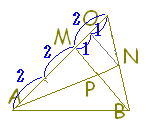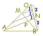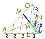 | (参考) 中学校の数学で相似図形の性質を用いると 右図によりAP:PN=4:1 ・・(a)右図によりBP:PM=3:2 ・・(b)(b)より右図AL:LB=2:1 ![]() b)より右図OP:PM=3:2 ![]() |