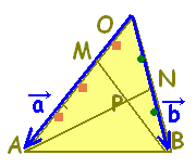 【例題1】△OABにおいて,OAを1:2に内分する点をM,OBの中点をNとし,ANとBMの交点をPとする. まず,線分ANのベクトル方程式を求める: Nの位置ベクトルは (sは実数)…(1)