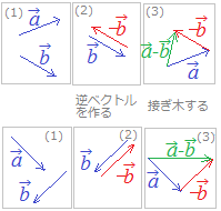 右上の図において(1)の問題に対して, \( \vec{a}-\vec{b} \)を作図するには,初めに(2)のように逆ベクトル \( -\vec{b} \)を作り,次に(3)のように接ぎ木するとよい.