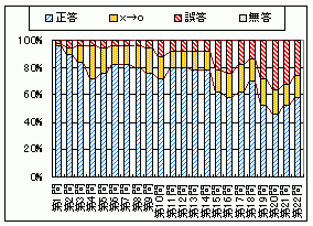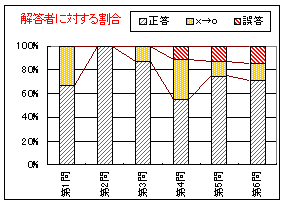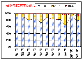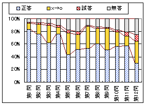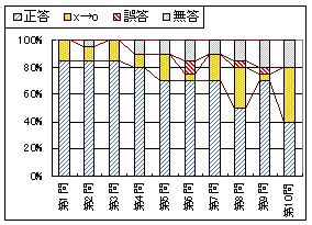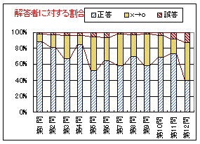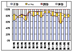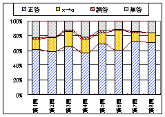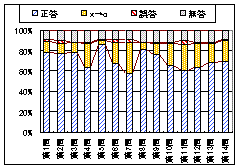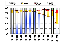 左のグラフ1は問題ごとの正答,誤答,無答の割合(正誤は最初の採点)で,黄色で示したものは初め誤答で再試行の結果正答に変った割合を表わす.