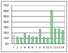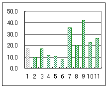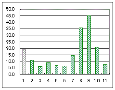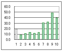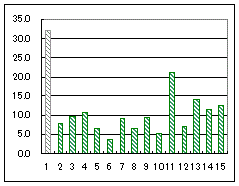 グラフ2は横軸が問題番号,縦軸は直前の操作以降その問題の採点までの経過時間を表わす.ただし,第1問は初めからの時間.