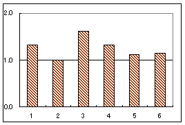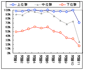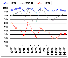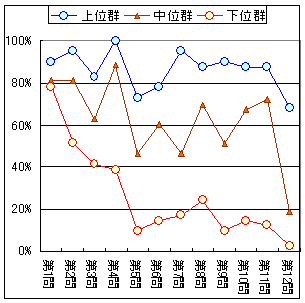 グラフ5は回答者全体をその合計得点によって上位群,中位群,下位群の3群に等分したときの群別・問題別正答率で,どの問題についてもUL指数(上位群と下位群の正答率の差)は0.39〜0.66と大きく,練習用だけでなくテスト用にも使えることが分かる.