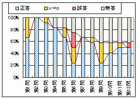 左のグラフ1は問題ごとの正答,誤答,無答の割合(正誤は最初の採点)で,黄色で示したものは初め誤答で再試行の結果正答に変った割合を表わす.