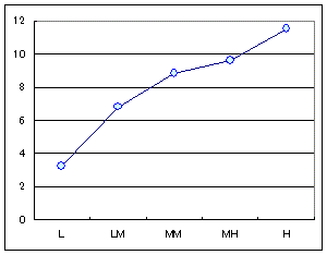 グラフ5は回答者全体をその合計得点によって下位群(L)〜上位群(H)の5群に等分したときの群別平均得点のグラフで,下位群と上位群において得点差が大きいことが分かる.