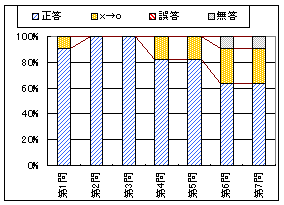 左のグラフ1は問題ごとの正答,誤答,無答の割合(正誤は最初の採点)で,黄色で示したものは初め誤答で再試行の結果正答に変った割合を表わす.