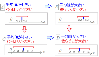 ■データの散布度(散らばり) 平均値が等しくてもデータの分布の様子が違う場合があります. 右図のAとC,BとDでは平均値が同じですが,散らばりが異なります.また,AとB,CとDでは散らばりが同じですが,平均値が異なります. このように,データの分布の様子をとらえるためには,中心付近がどこにあるかを示す平均値だけでなく,散らばり具合を表す数値もしばしば併用されます.