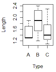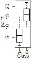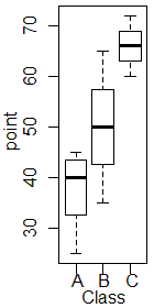 層別(A,B,Cという種類別の)箱ひげ図というものを作成するためには,右の表6の形式でデータを準備します.(並べ方は適当でいいですが,種類別に箱ひげ図を作るには数値の欄以外に種類を表す文字が必要です.)RとRコマンダーのインストール方法は,この頁に解説があります. ≪手順≫ (1) Excelの中からRコマンダーを起動しておきます. (2) Excelで表6の形式でデータを準備し,データの範囲をコピーしてクリップボード(メモリ)に入れます. (3) Rコマンダーのメニューで,データ→データのインポート→テキストファイルまたはクリップボード...から 「ファイル内に変数名あり」にチェック,「クリップボード」,フィールドの区切り記号は「タブ」→OK (4) データが正しくインポートされたかどうか[データセットを表示]のボタンを押す (5) グラフ→箱ひげ図→層別のプロット→OK,OK (6) 右図1の箱ひげ図ができます.