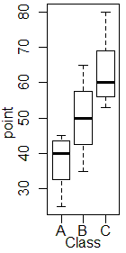 Rコマンダーの箱ひげ図では,極端値(外れ値)は※2 図1のType Cの箱ひげ図を見ると,最大値が第3四分数から離れたところにあることが分かります.また,Type Cは左寄りの分布になっています. ※3 Type Aの箱ひげ図を見ると,最小値が中央値に一致しており,下位グループが濃い,左寄りに分布になっていることがわかります. |